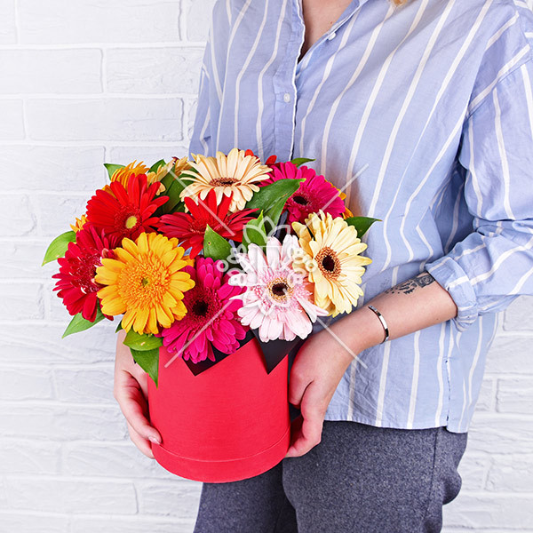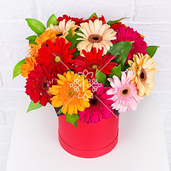 Радостные встречи – коробка с разноцветными герберами
